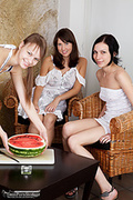 Three charming pic masterpieces chicks babes gathered together to eat some melon and get nude and naughty.