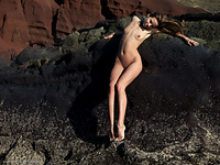 Romy flaunts her exotic olive-complexion body and pretty pink slit while posing a-top of white rock and ruble.