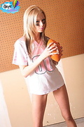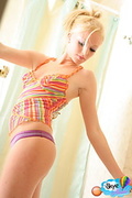 Perky blonde teen skye teases in a sexy tiny colorful top and a purple thong