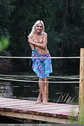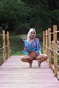 Kristy playfully poses naked on the dock by the river.