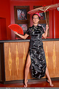 Sarka poses in her black cheongsam dress that shows off her long and slender physique.