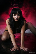Olya strikes a sultry gaze towards the camera as she sprawls on the wet floor, her wet look, lace corset and fishnet stockings all add to her allure and beauty as the universe goddess.