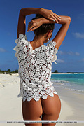 Ramina poses in her blue striped bikini and denim shorts with a bright effervescent smile that perfectly compliments her natural beauty.