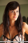 Blue-eyed brunette lilu m smiles teasingly for the camera as she poses in delicate lace lingerie.