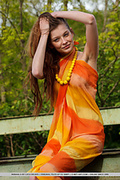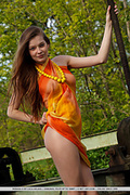 Malena, with her tempting gaze, beautiful puffy breasts, and slender physique strips her sexy orange dress baring her delectable assets in front of the camera.
