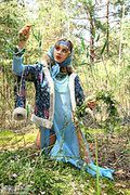 This image set is about a gorgeous blonde naked girl amour angels straight who takes off her blue dress to do a stirring tease show in the woods.
