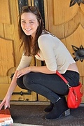 Engaging, petite model with small but perky breasts, fresh and moist labia, and round, firm butt.