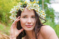 Incredible busty natural woman sweet hottie with a wreath of daisies on her head showing body in a sand pit.