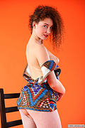 Adele wears orange top, mini skirt and patterned pantyhose for pussy shot