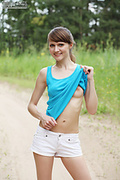 Yummy amour angels petite dreamlike outdoor model thumbnail playfully strips tasteful fresh topless on a bed to show you her petite body and shaven twat.