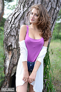 Cute brunette nature nudes showy beauty plays around in the woods, embracing her top sexual sexy body and her childish spirit.