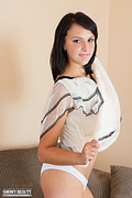 Delightful shapely brunette bombshell taking off clothes and spreading legs on the sofa.