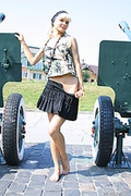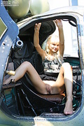 Gorgeous cheeky angel is wearing military clothes and poses near grenade launcher, tank and different army airplanes.