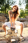 Captivating sweet long-haired brunette with a topless tasteful art nude green necklace on her tender neck, but without panties is sitting on the ruins and lifts up her skirt.