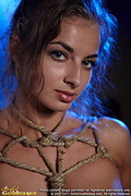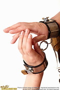 Horny blonde babe in sexy lingerie black stockings and with the tied hand
