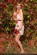 The fantastic young timid blonde takes off her pink dress and poses nude in the beautiful color autumn forest.
