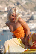 Beautiful young sexy blonde takes off her orange t-shirt and skirt and poses nude against a very picturesque bay.