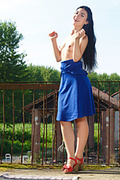 Dressed in a pretty royal blue dress, luna is enjoying the outdoors from her balcony. She lifts up her dress to give you a tease. Uninhibited, she strips naked and exposes her small perky breasts and thick, untamed full bush.