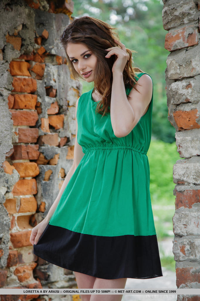 Loretta strips her green sexy flowing dress and flaunts her lean, nubile body and delectable pussy by the brick wall ruins.